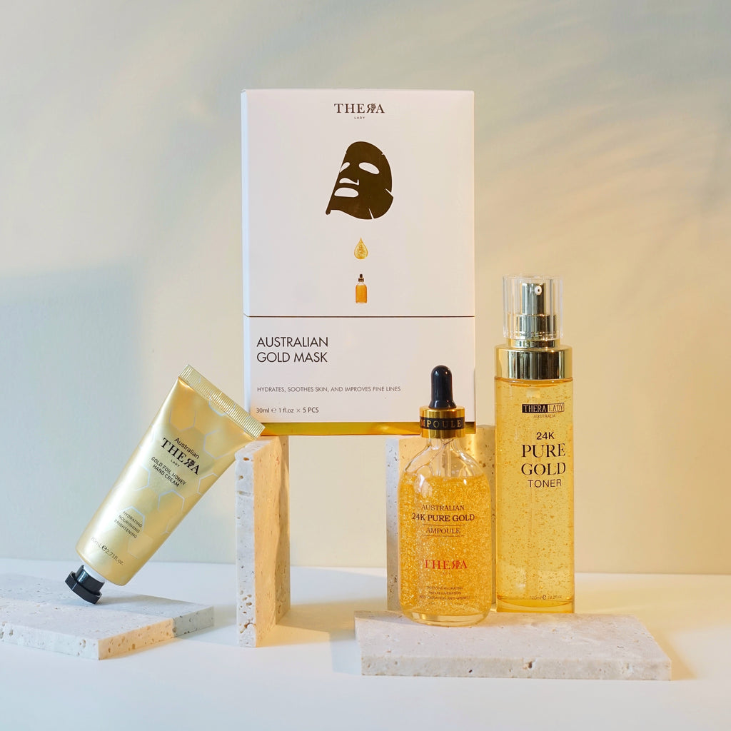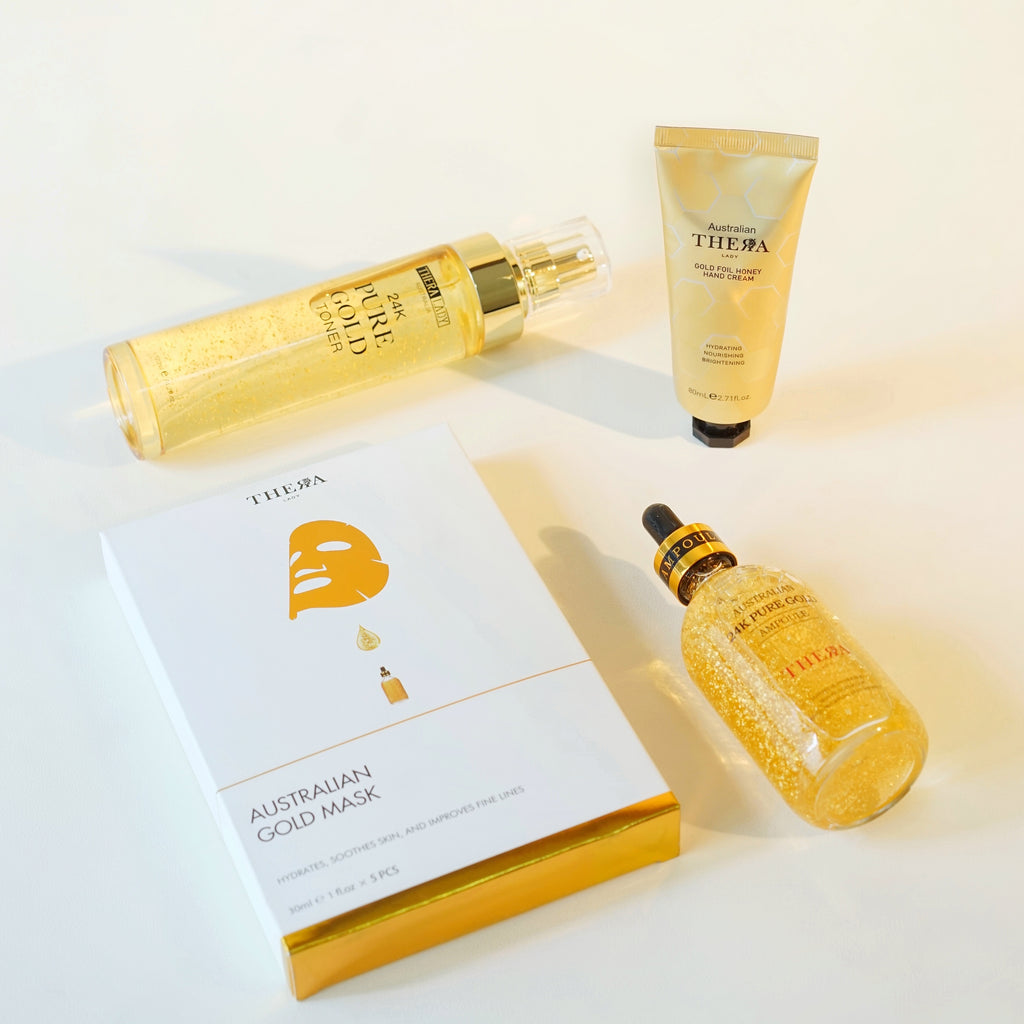 The Gold Bundle includes: 1 x 24k Pure Gold Ampoule, 1 x Pure Gold Toner, 1 x Gold Mask, 1 x Gold Foil Honey Handcream